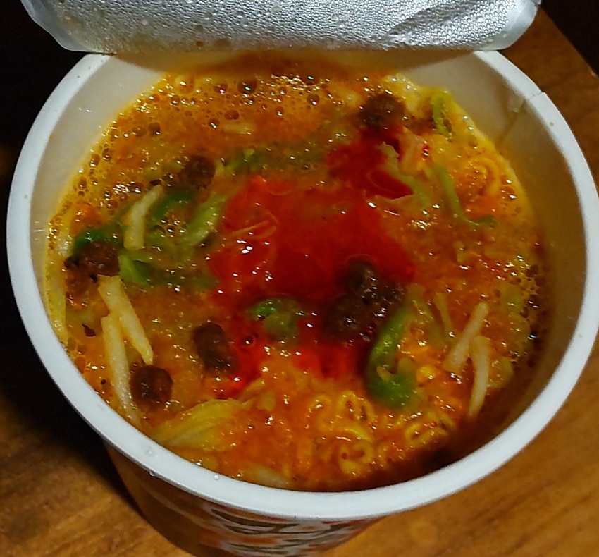 The noodles are thicker than regular Cup Noodles, and the soup clings to them really well — slurping them up gives you a real sense of satisfaction.